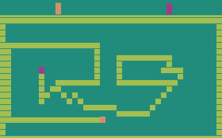 Der Inhalt jedes Bildes kann durch den Kernel aus verschiedenen konfigurierbaren grafischen Objekten, die der TIA bereitstellt, aufgebaut werden. Eine davon ist der horizontal grob aufgelöste Hintergrund, das Spielfeld.[114] Andere grafische Objekte sind die beiden feiner aufgelösten Spielfiguren, zwei Geschosse und der Ball. Sie werden vom TIA gemäß benutzerdefinierbaren Überlappungsregeln in das aktuelle Spielfeld kopiert und dann einer Kollisionsprüfung unterzogen. Auf diesem Weg kann überprüft werden, ob sie sich untereinander oder Teile des Spielfeldes wie beispielsweise Labyrinthwände berühren. Diese Fähigkeiten dienen der vereinfachten Erstellung von Spielen mit beweglichen interagierenden Grafikobjekten. Durch entsprechende Programmiertechniken können beispielsweise auch wesentlich mehr als nur zwei Spielfiguren gleichzeitig auf dem Bildschirm dargestellt werden. Den vom TIA bereitgestellten Objekten und auch dem Hintergrund oder Teilen davon kann zudem eine Farbe zugeordnet werden. Bei NTSC-Geräten steht dazu eine Palette von 128, bei PAL-Konsolen von 104 verschiedenen Farben zur Verfügung. Von SECAM-Geräten können dagegen lediglich 8 dargestellt werden.[115]